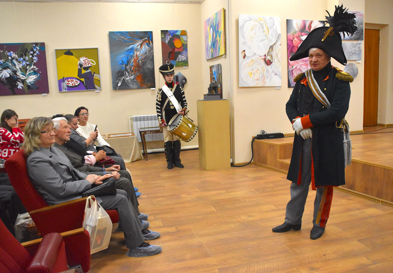 На открытии учащихся и педагогов школы искусств и всех желающих председатель творческого Союза, заслуженный художник России, скульптор-монументалист, а также председатель клуба военно- исторических реконструкций «Севский пехотинец» Александр Ромашевский встречал в военной форме генерала армии времён войны 1812 года, что было очень необычно. Он рассказал зрителям про авторов и их художественные произведения.