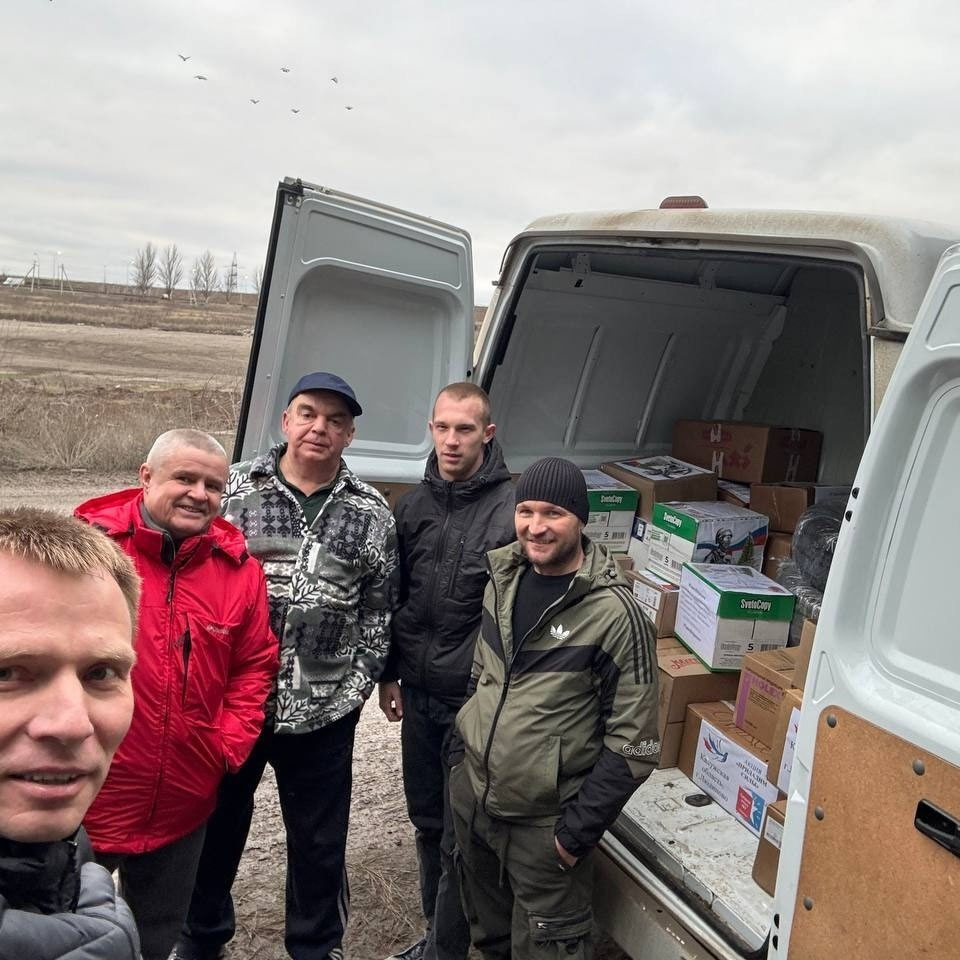 Бойцам передали комплект колес для микроавтобуса «Соболь», 250л моторного масла, пластиковые канистры, утеплитель для блиндажей, топоры и молотки, болгарка и сварочный аппарат, метизы, топливные брикеты, маскировочные сети, толстовки, плащ-палатки, спальные мешки, влажные салфетки.