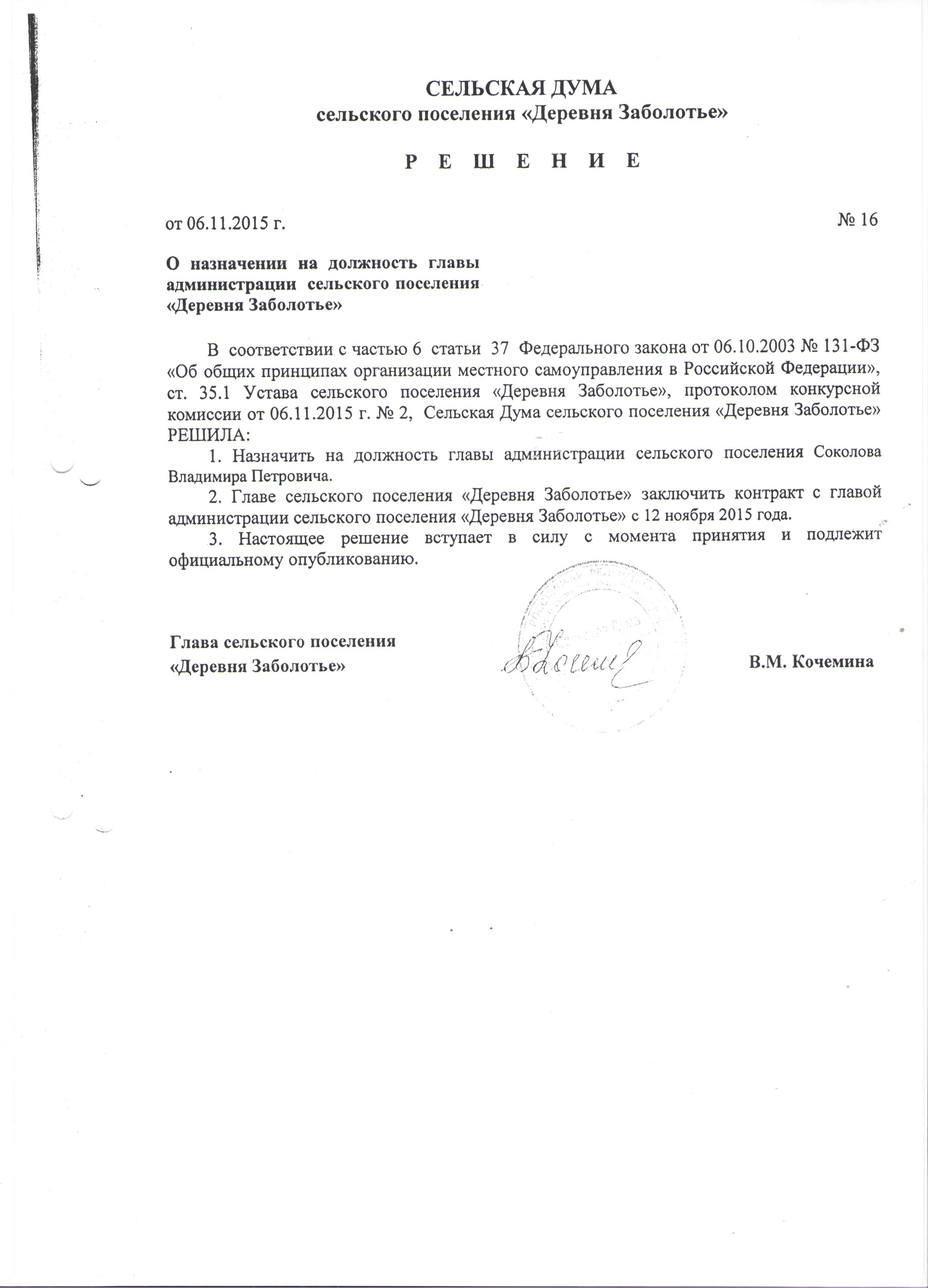 Решение сельской думы сельского поселения "Село Заболотье" Людиновского района Калужской области от 6.11.2015г. №16