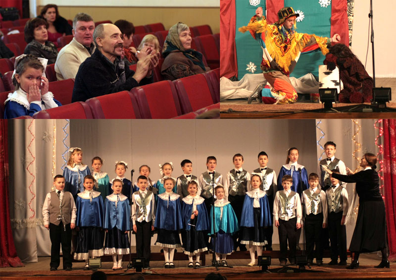 Начался он праздничным молебном, затем была открыта выставка художественных работ учащихся Воскресной школы. Рисунки, лепка, папье-маше, поделки из разных бросовых материалов превратились в галерею чествования Рождественского праздника. Сверкающую мишуру-ленточку перерезал настоятель храма протоиерей Алексий Жиганов с детворой. Священник поздравил учащихся школы и родителей с Рождеством Христовым, и празднование началось… Нарядные, радостные мальчишки и девчонки Воскресной школы с мамами и папами, бабушками и дедушками исполнили тропарь праздника возле сияющей огнями и звездой ёлки: