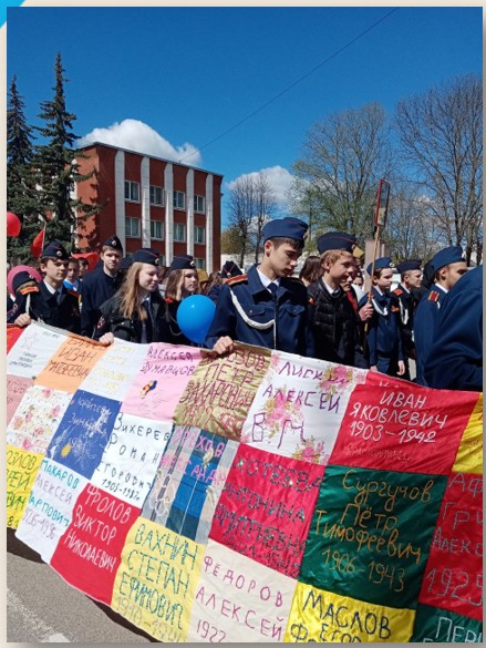 - На протяжении всего периода существования школы у нас всегда было в приоритете гражданско-патриотическое воспитание, - рассказывает Валентина Алексеевна. - Коллектив школы награжден Всероссийским Почётным знаком «За активную работу по патриотическому воспитанию граждан РФ». В 2013 году наша школа первой в Калужской области приняла участие в проекте «Имя героя - школе», а наш музей боевой славы неоднократно становился лауреатом и призёром Всероссийских и областных конкурсов-смотров школьных музеев. Мы участвуем в Международной акции «Солдатский платок», а Полотнище с именами наших героев-земляков войны и тыла хранится в Государственном военном музее на Поклонной Горе в Москве. И этот проект продолжается, в нем принимают участие не только дети, но и жители Людинова.