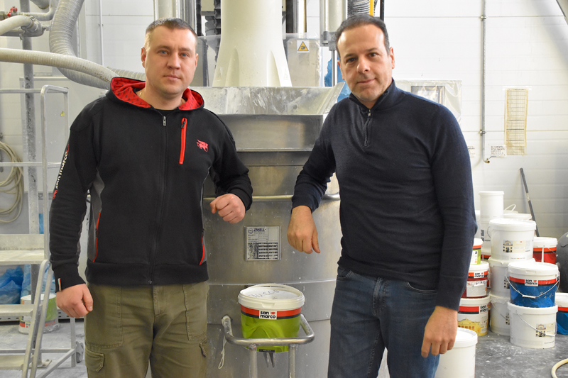 Надо отметить, что практически все сотрудники, пришедшие сюда со дня основания завода, работают и сегодня. К примеру, с первых дней создания завода трудится Михаил Чеботарев, руководитель производства. По словам Сальваторе, грамотный специалист, целеустремленный, с активной жизненной позицией. На приеме заказов, работе с документами и логистике хорошо зарекомендовала себя ведущий специалист Кира Догарева. Ответственный участок работы в цехе, особенно при смешивании красок, - у рабочего Дмитрия Калуги.