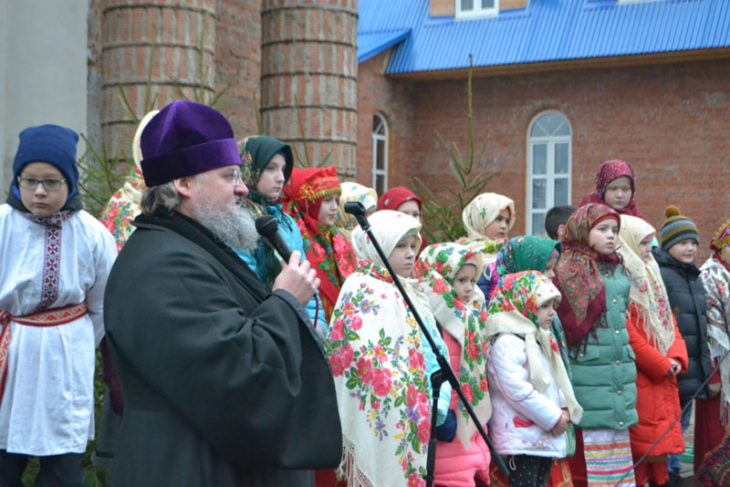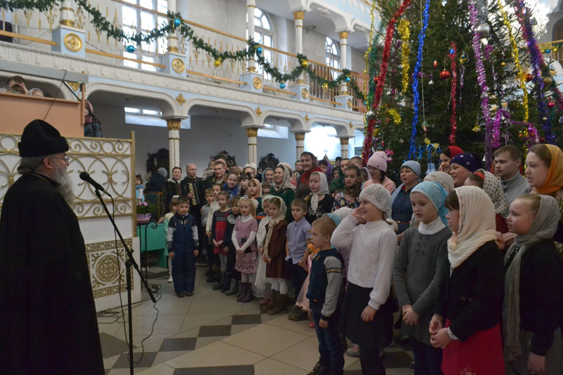 Волк, Лисица, Зайки, дети, родители вместе с дедушкой Морозом и Снегурочкой весело кружились в хороводе вокруг нарядной ёлки и пели любимые песни. Водил хороводы с нарядной ребятней и батюшка-настоятель. В этот светлый праздник ребята пели песни, рассказывали стихи, выразительно читали тропарь, за что отец Алексий и дед Мороз одаривали их подарками.