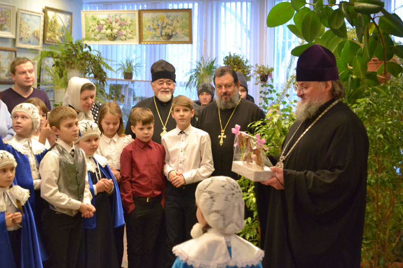Встречали правящего архиерея празднично и торжественно. Учащиеся воскресной школы Казанского собора преподнесли владыке красочные рождественские подарки.