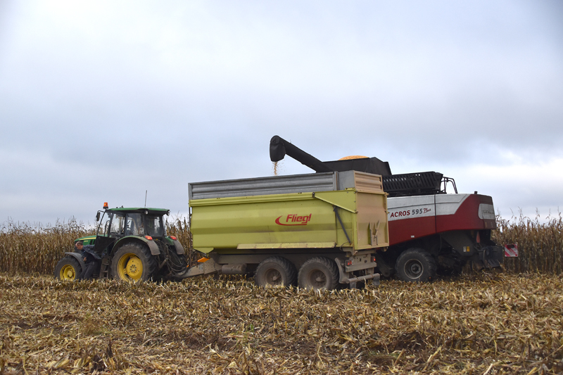 Комбайны «АКРОС» с похожими на широкие стрелы жатками бороздили кукурузное поле. Это специальные жатки, предназначенные именно для уборки кукурузы. Снизу спрятаны лезвия, которые срезают стебель, специальный механизм «забирает» его внутрь через специальное окошко. В барабанах отделяются листья, а также обмолачивается само зерно, которое заполняет бункер. Комбайн оставляет за собой измельченные остатки стебля и пустые початки.