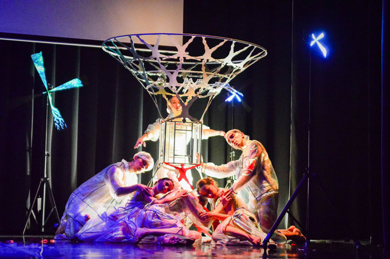 На эту сверхзадачу постановки «работает» и многообразное, постоянно меняющееся техническое оформление спектакля: голограммы, виды Вселенной и закрученных спиралей, изображения лиц, на глазах у зрителей в одно мгновение стареющих и молодеющих, другие световые акценты.