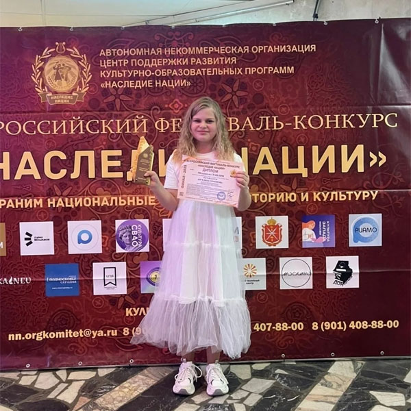 Солистка «Народного самодеятельного коллектива» эстрадно вокальной студии «АРТ Созвездие» под руководством Екатерины Свертиловой достойно представляла наш город и заняла высшую награду - Гран-при Всероссийского фестиваля-конкурса "Наследие нации".