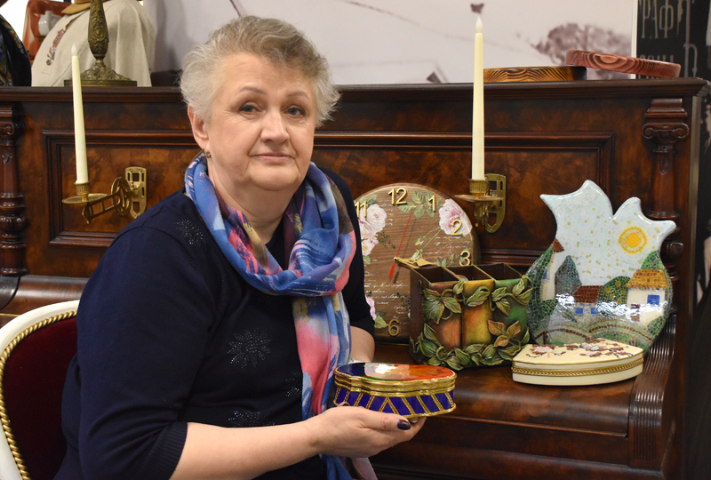 Сначала был декупаж. Татьяна Петровна декорировала самые разные предметы быта и интерьера: разделочные доски, панно, часы, вешалки, ключницы и прочее. Когда занималась этим, бывало, что салфеточка оказывалась меньше, чем поверхность, на которую она накладывалась. Потребовалось подрисовывать. Надо было в срочном порядке научиться подбору цветов и смешиванию красок. Нашла в интернете преподавателя, который давал онлайн-уроки и доступно все разъяснял. После чего в портфолио мастерицы появилось с полтора десятка картин. Вообще, все имеющиеся знания она почерпнула на бескрайних просторах интернета. А вот навык и умения пришли с опытом.